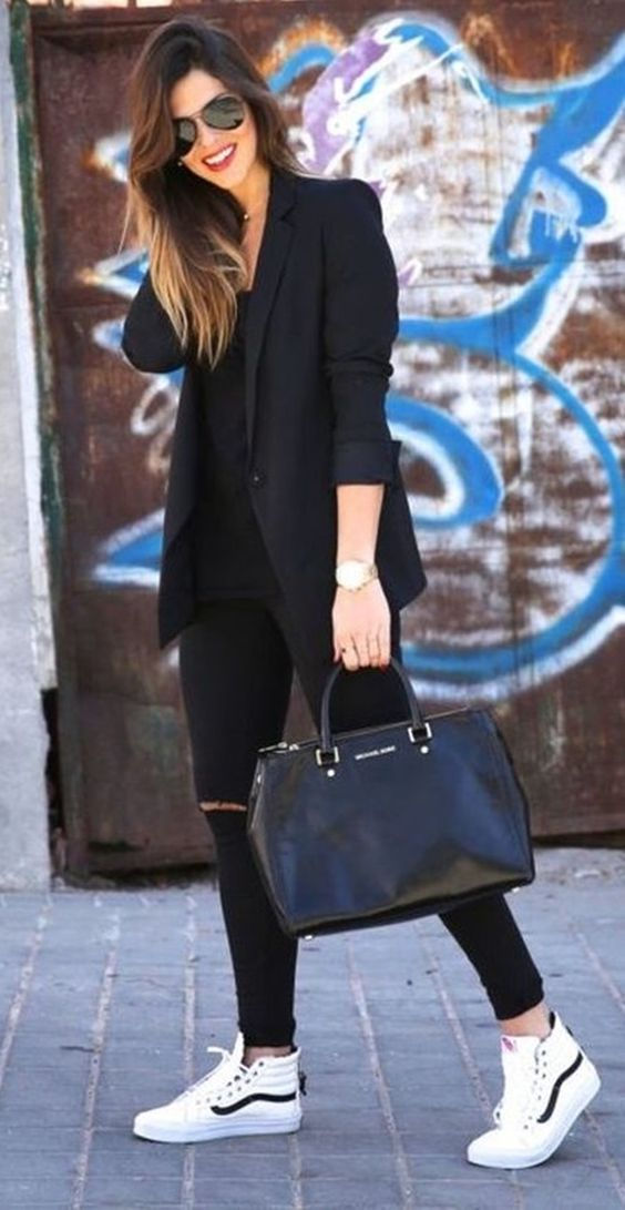 Uno de los colores que nunca puede faltar en tu closet es el negro. Si tu estilo es relajado y sport; pues este look es ideal para ti. Solo necesitas un blazer negro y un pantalón negro, combinándolos con un par de zapatillas que te harán lucir super cool. Simple pero impactante.